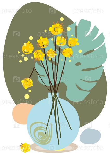 Абстрактные плакаты с вазами. Модный коллаж натюрморта с горшком, фруктами, вазой и тропическим пальмовым листом