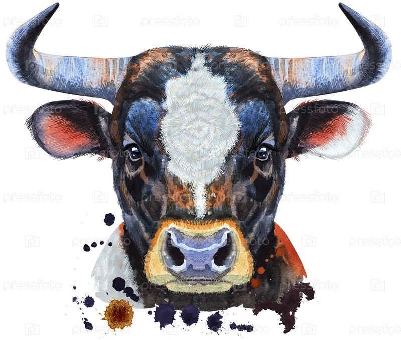 Акварельная иллюстрация черного быка с белым пятном