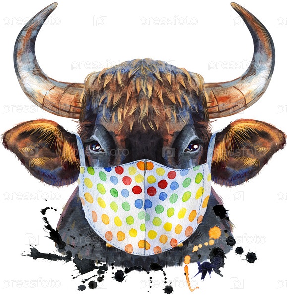 Бык в защитной маске. Акварельная графика. Бык животных иллюстрации с брызгами акварель текстурированный фон