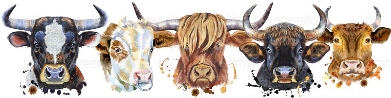 Симпатичная рамка из акварельных портретов быков. Для графики на футболках. Иллюстрация акварельных быков