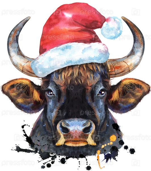 Акварельная иллюстрация черного мощного быка в шляпе Санты с брызгами