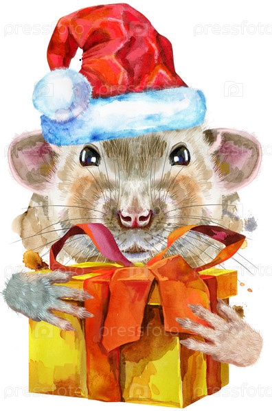 Милая белая крыса с подарком в шляпе Санты для графики на футболках. Акварельная иллюстрация крысы
