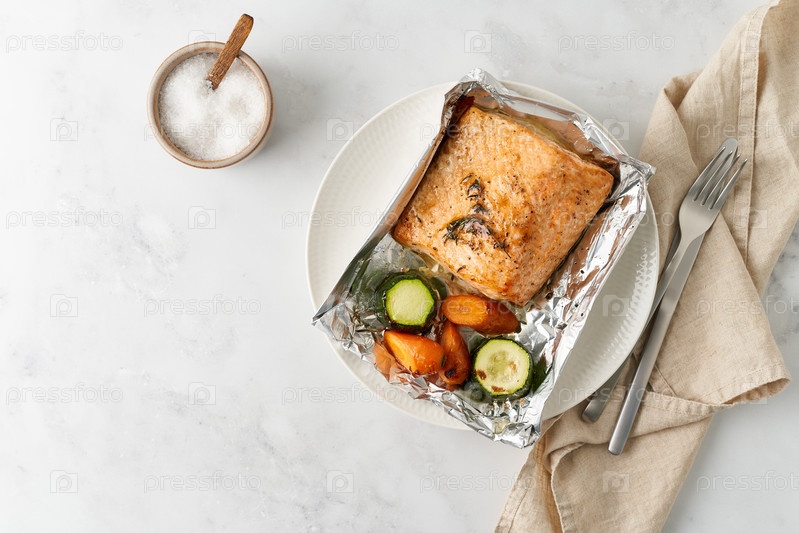 Ужин в фольге с рыбой. Филе лосося с овощами на белой тарелке. Копировать пространство