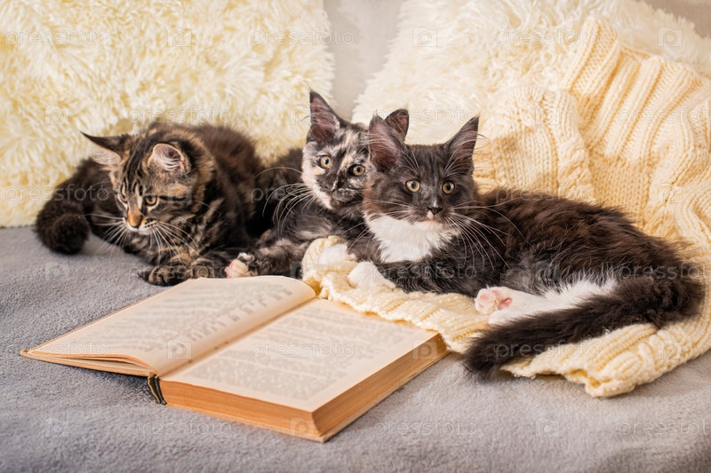 Два котенка мейн-куна играют лежа на вязаном свитере рядом с открытой книгой в уютной атмосфере