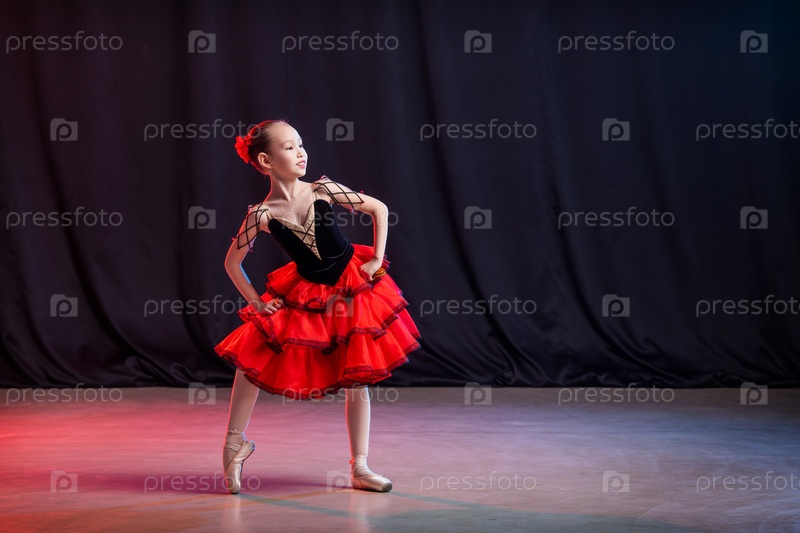 Маленькая девочка-балерина танцует на сцене в пачке на пуантах с кастанедасом, классической вариацией Китри