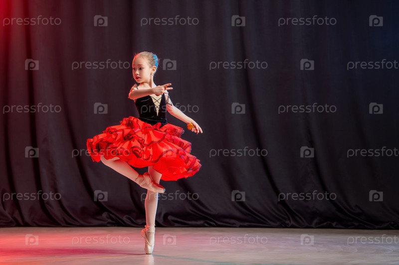 Маленькая балерина танцует на сцене в балетной пачке на пуантах с кастанедами, классической вариацией Китри