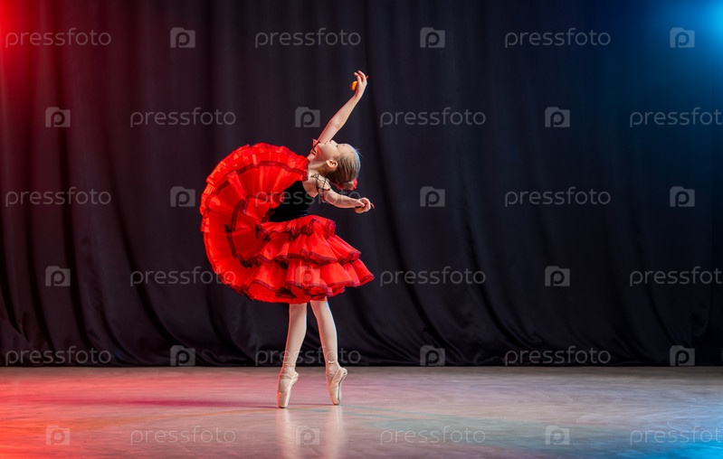 Маленькая балерина танцует на сцене в балетной пачке на пуантах с кастанедами, классической вариацией Китри