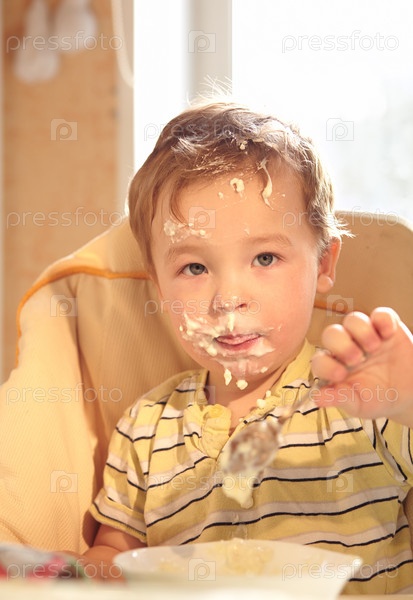 Двухлетний мальчик ест кашу утром