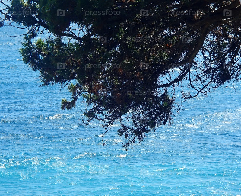 Ветки крымской сосны (сосна Палласа) на фоне синего моря. Южный берег Крыма