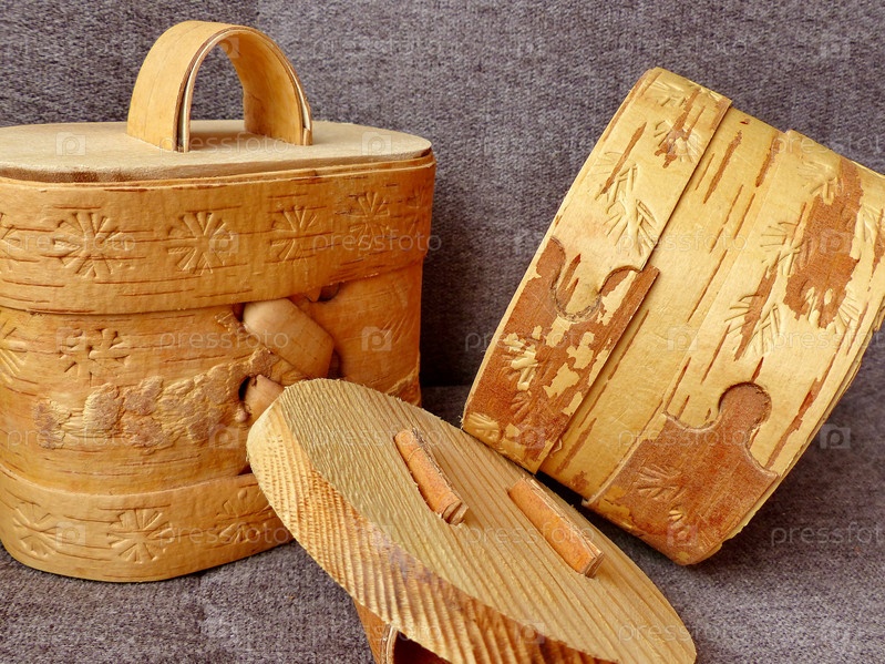 Туесок - небольшая берестяная коробочка с крышкой, для хранения сыпучих продуктов. Кухонные принадлежности. Народные промыслы России. Ретро. Изделия из бересты изготавливались большинством обществ задолго до того, как была изобретена керамика