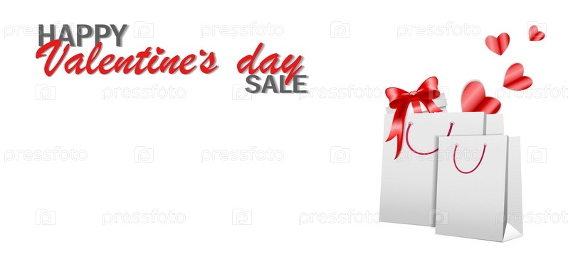 Подарочные пакеты для покупок на белом фоне, с подарочной коробкой и красными сердцами, концептуальный баннер с надписью День святого Валентина, распродажа, шоппинг