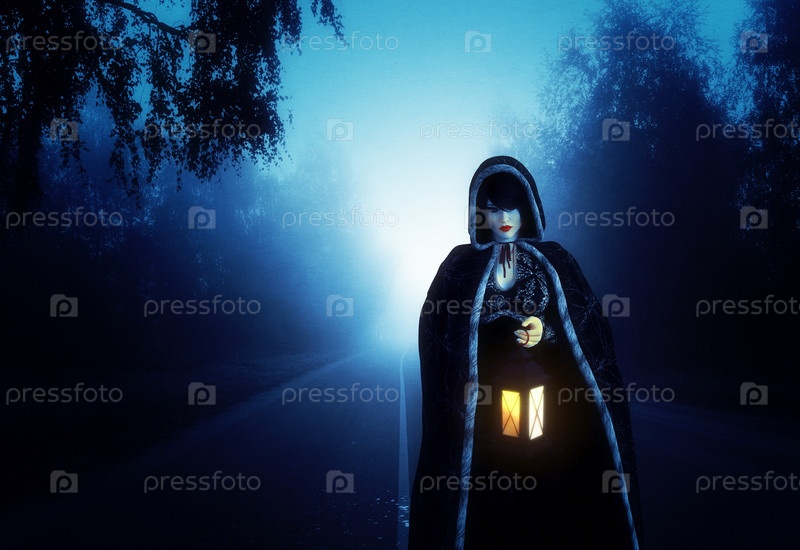 Женщина с фонарем на туманной дороге