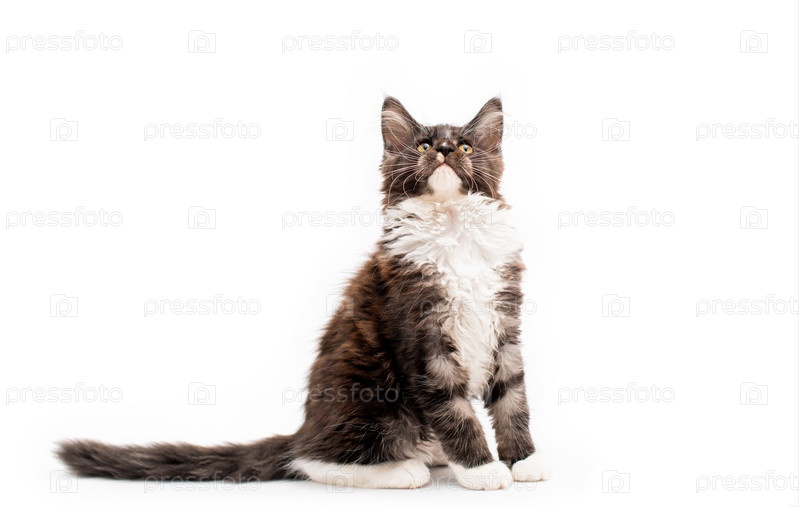 Выразительный серебристый котенок Мейн Кун сидит лицом вперед. Изолированный белый фон