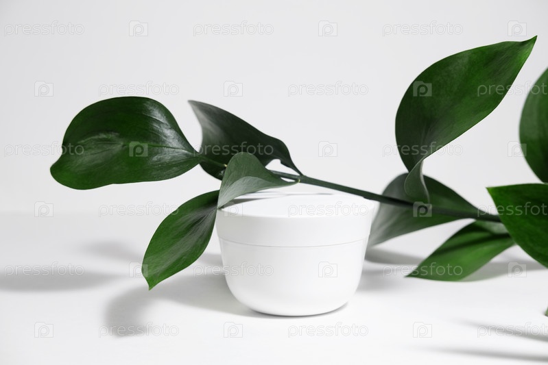 Макет белой банки крема на бело-сером фоне, на белом столе с зелеными листьями тропического растения, с жесткими тенями. Стильный внешний вид продукта, индивидуальность