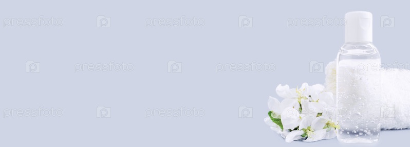 Бутылка мгновенного антисептического дезинфицирующего средства для рук, прозрачный гель, выделенный на синем фоне, без этикетки. Антибактериальный, водно-спиртовой гель, этиловый спирт. Мини дорожный карман небольшого размера. Баннер. Копировать пространс