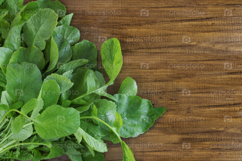 Молодые листья редьки на деревянном фоне. Полезные листья для салата. Зелень для приготовления пищи. Отличная еда. Копировать пространство