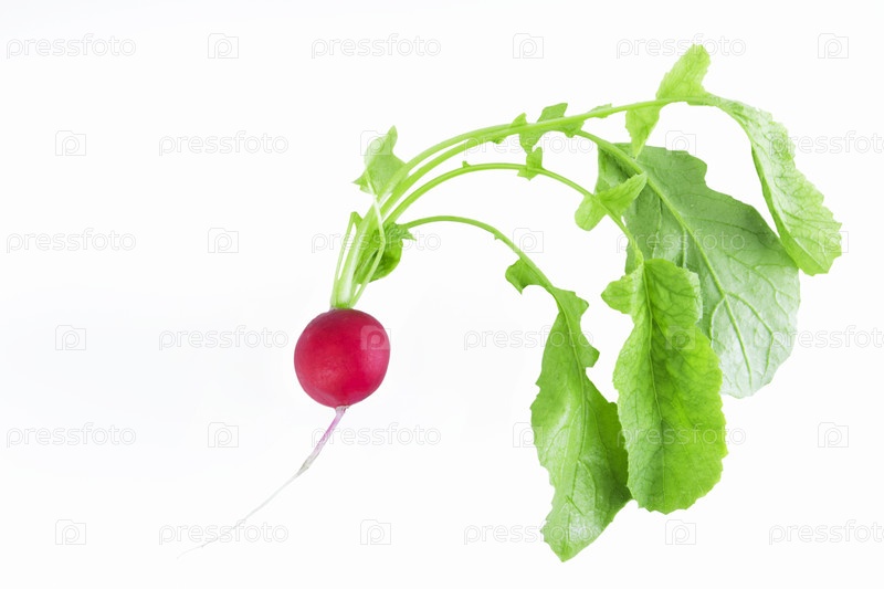 Свежая молодая редька с листьями, изолированными на белом фоне. Выборочный фокус