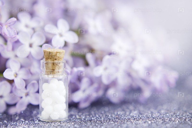 Гомеопатические глобулы в стеклянной бутылке, крупный план на фоне сиреневых цветов. Выборочный фокус. Концепция альтернативной медицины. Копировать пространство