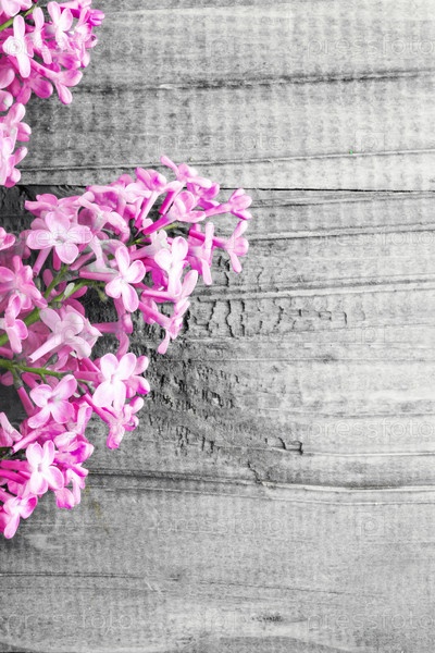 Ветка розовой сирени крупным планом на сером фоне деревянных. Концепция открытки, фон для спа-салона. Вертикальный. Копировать пространство