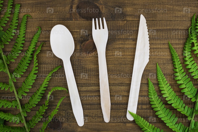 Экологически чистая одноразовая кухонная утварь на деревянном фоне, рядом с зеленым папоротником. деревянная вилка, ложка и нож. Экология, концепция нулевых отходов. Вид сверху. Плоская укладка