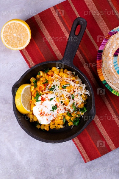 Эскиты, кукуруза на гриле, подается с тертым сыром, сметаной, порошком чили и ломтиком лимона на чугунной сковороде. Мексиканская уличная еда. Вид сверху
