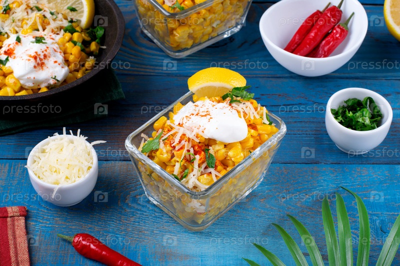 Эскиты, кукуруза на гриле, подается с сыром, сметаной и порошком чили в стеклянной чашке на синем столе. Мексиканская уличная еда. Кукурузная чашка Элоте