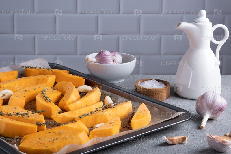 Кусочки спелой тыквы, приготовленные для запекания