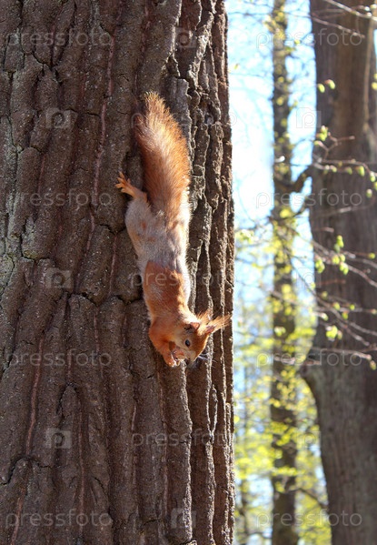 Белка сползает по стволу дерева с орехом в лапах в Петергофе