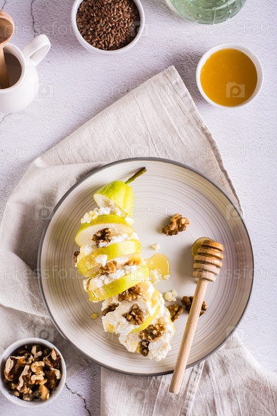 Слои груши, рикотты с грецким орехом, залитые медом на тарелке на столе. Верхний и вертикальный вид