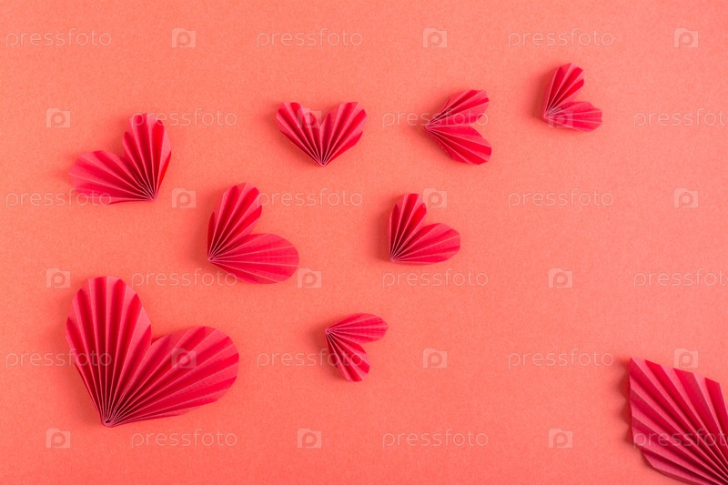 Монохромный красный фон с летающими сердцами оригами. День Святого Валентина