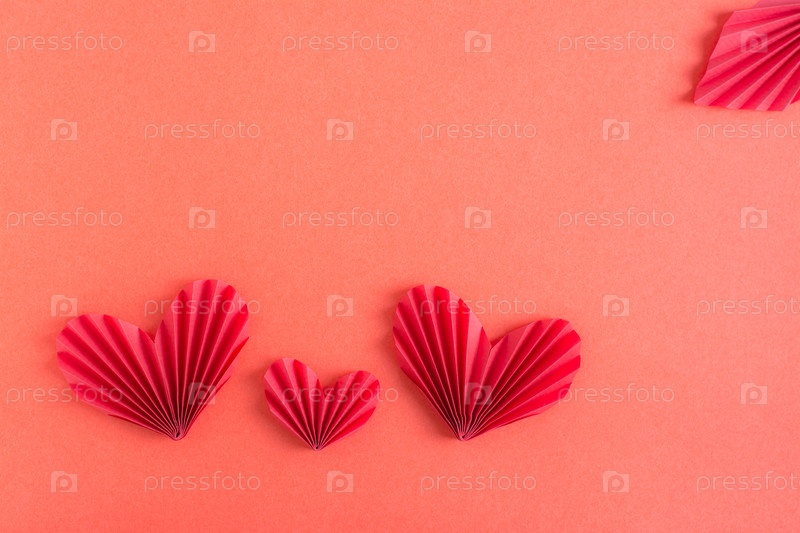 Монохромный красный фон с сердечками оригами. Концепция семьи. День Святого Валентина