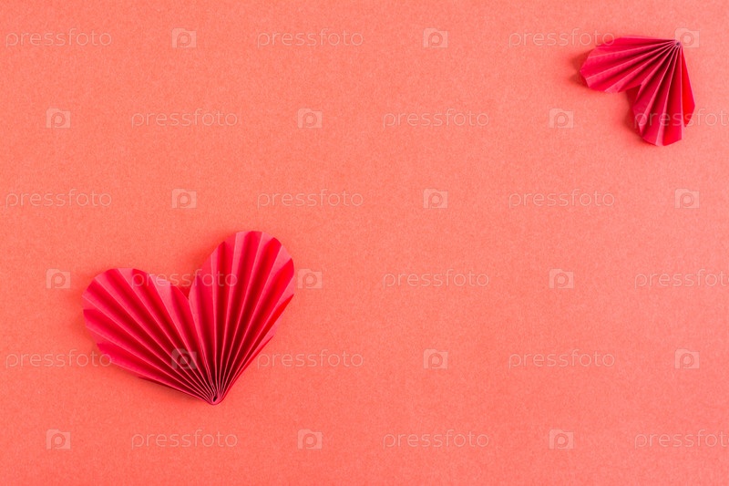 Открытка с сердечками оригами. Красный монохромный фон. Копировать пространство
