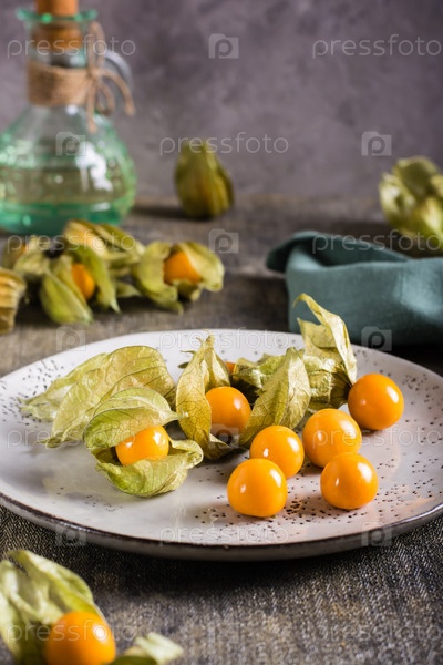 Спелые плоды физалиса на тарелке. Органическая вегетарианская еда. Вертикальный вид