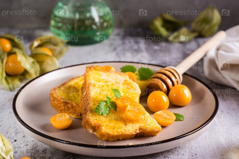 Жареный тост в яйце с физалисом, медом и мятой на тарелке. Домашний десерт