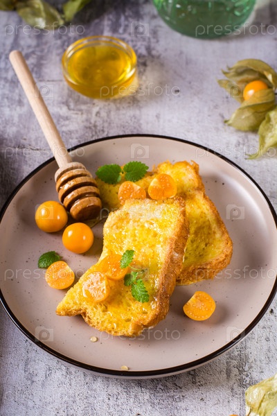 Жареная брускетта с физалисом, медом и мятой на тарелке. Домашний десерт. Вертикальный вид