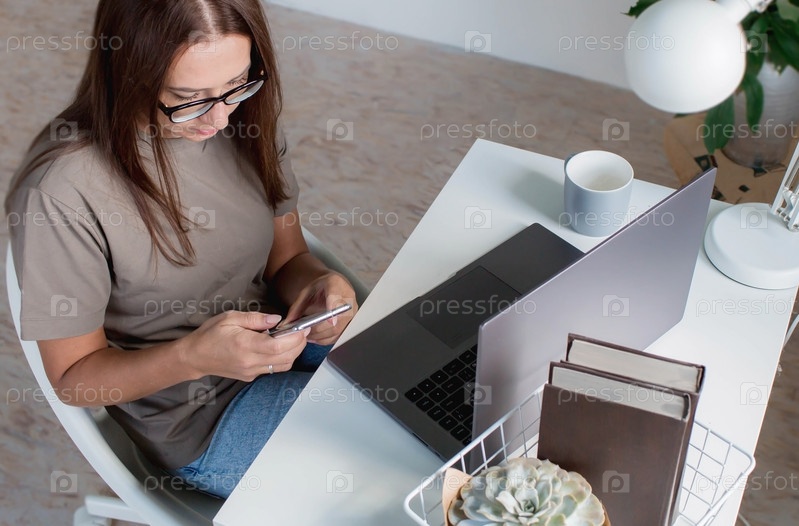 Молодая, счастливая, красивая деловая женщина-фрилансер сидит в домашнем офисе с ноутбуком и смартфоном в руках. Женщина работает дома или делает покупки в интернет-магазине
