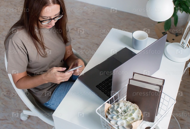 Молодая, счастливая, красивая деловая женщина-фрилансер сидит в домашнем офисе с ноутбуком и смартфоном в руках. Женщина работает дома или делает покупки в интернет-магазине
