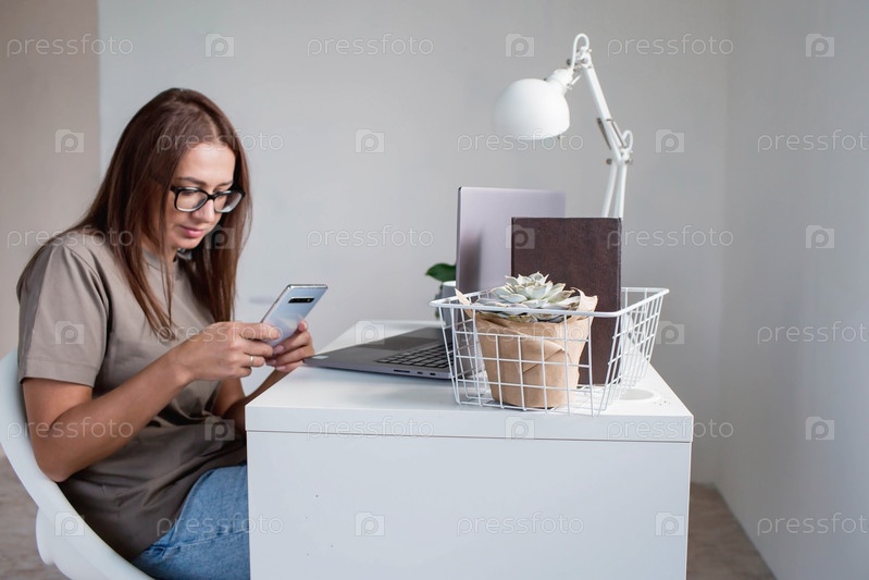 Молодая, счастливая, красивая деловая женщина-фрилансер сидит в домашнем офисе с ноутбуком и смартфоном в руках. Женщина работает дома или делает покупки в интернет-магазине