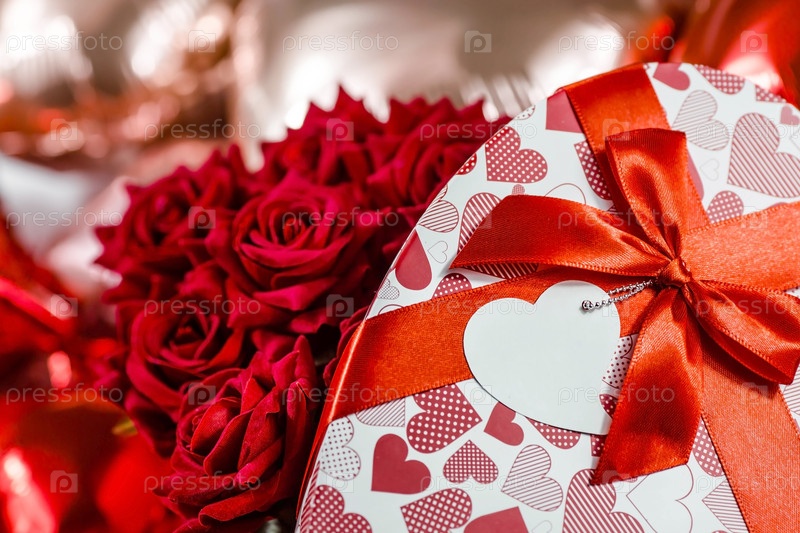 День Святого Валентина. Красные розы в белой коробочке в виде сердца на фоне шариков из фольги. Подарок женщинам на праздник. Концепция доставки цветов. флористика и цветочные магазины