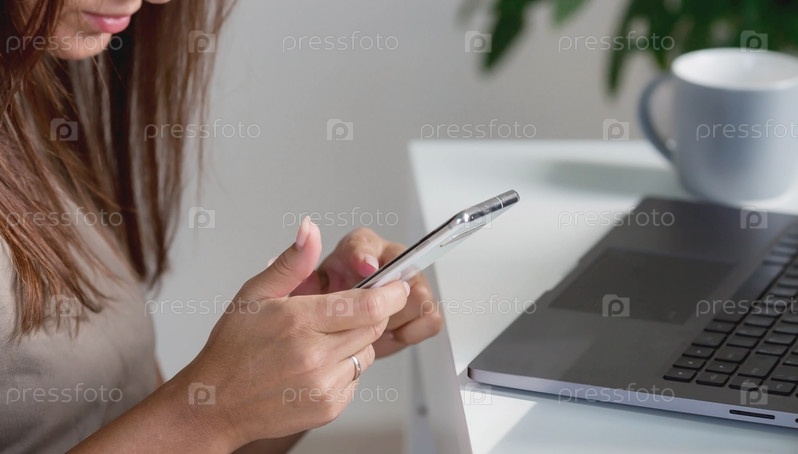 Молодая, счастливая, красивая деловая женщина-фрилансер сидит в домашнем офисе с ноутбуком и смартфоном в руках. Женщина работает дома или делает покупки в интернет-магазине