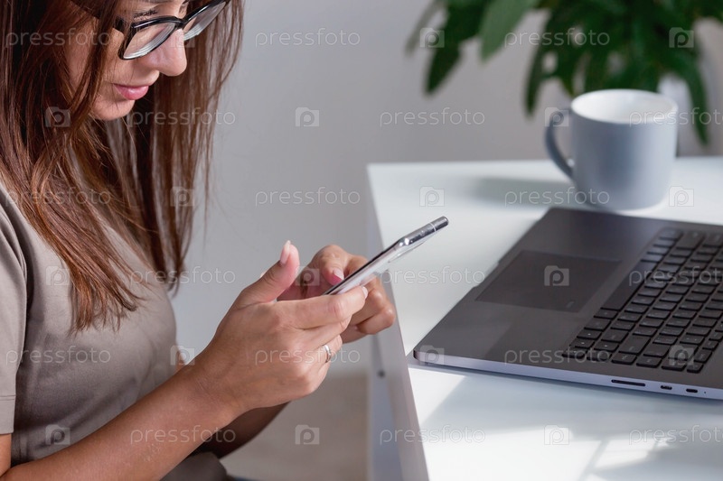 Молодая, счастливая, красивая деловая женщина-фрилансер сидит в домашнем офисе с ноутбуком и смартфоном в руках. Женщина работает дома или делает покупки в интернет-магазине