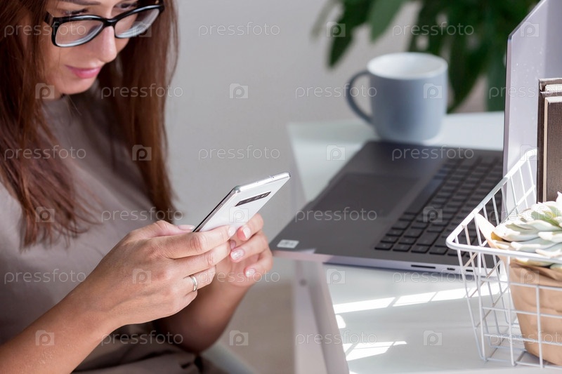 Молодая, счастливая, красивая деловая женщина-фрилансер сидит в домашнем офисе с ноутбуком и смартфоном в руках. Женщина работает дома или делает покупки в интернет-магазине