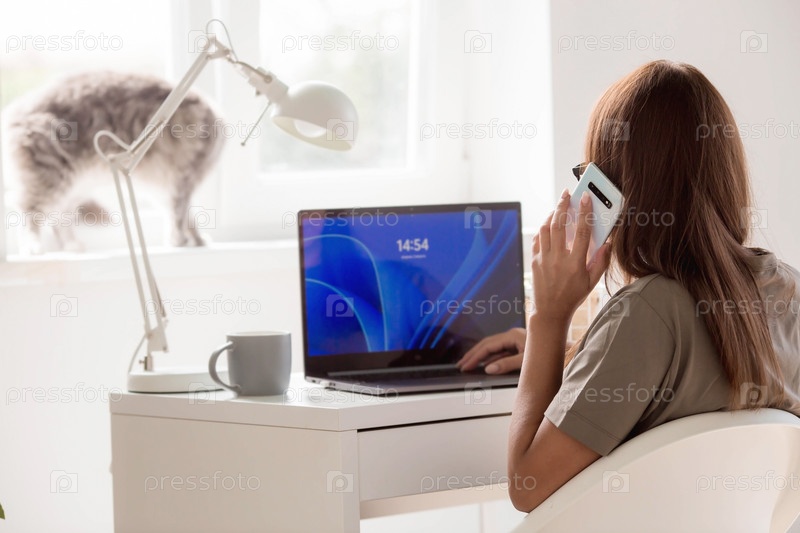 Молодая, счастливая, красивая деловая женщина-фрилансер сидит в домашнем офисе с ноутбуком и смартфоном в руках. Женщина работает дома или делает покупки в интернет-магазине