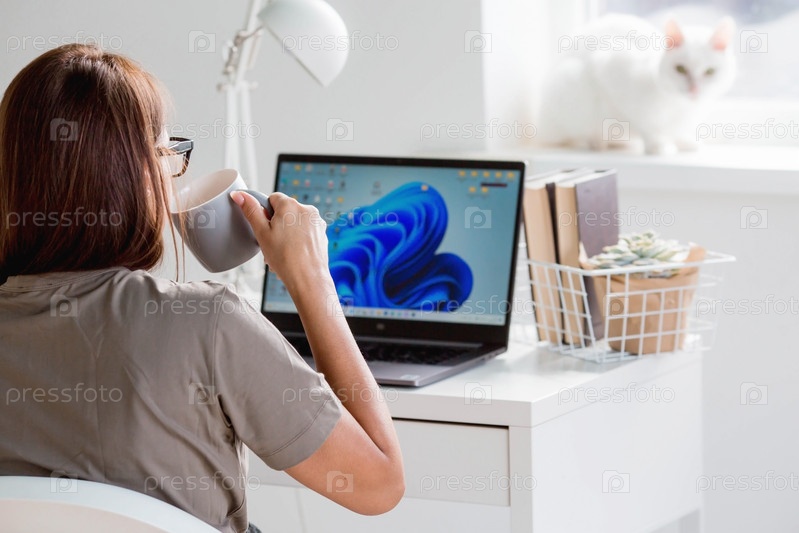 Молодая счастливая красивая деловая женщина-фрилансер сидит в домашнем офисе с ноутбуком, смартфоном и пьет кофе. Женщина работает дома. Кот на заднем плане