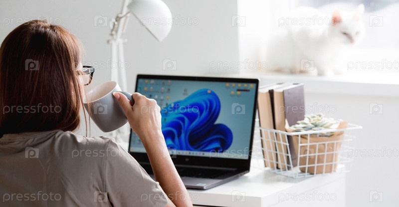 Молодая счастливая красивая деловая женщина-фрилансер сидит в домашнем офисе с ноутбуком, смартфоном и пьет кофе. Женщина работает дома. Кот на заднем плане