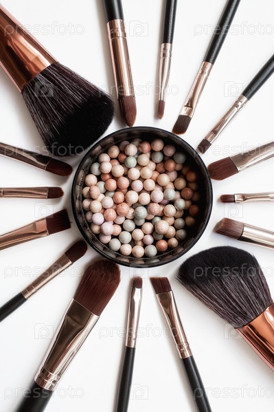 Кисти для макияжа и пудра, образующие круг на светлом фоне. Горизонтальный шаблон визитной карточки визажиста или дизайна флаера