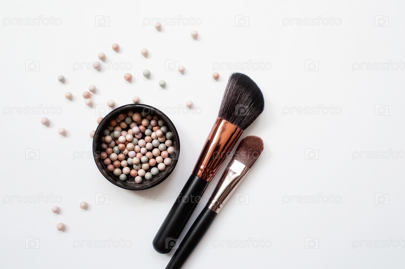 Кисти для макияжа и пудра на светлом фоне. Горизонтальный шаблон визитной карточки визажиста или дизайна флаера