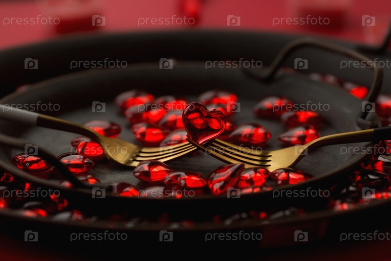 Баннер. Сервировка праздничного стола. Сердце на вилке крупным планом. Концепция праздника. День Святого Валентина. Скопируйте место для надписей