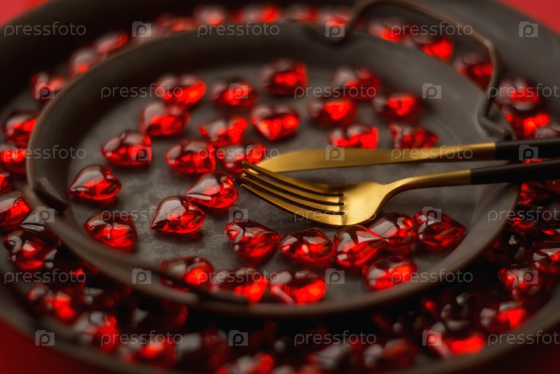 Баннер. Сервировка праздничного стола. Сердце на вилке крупным планом. Концепция праздника. День Святого Валентина. Скопируйте место для надписей