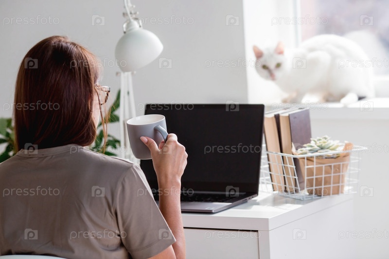 Молодая счастливая красивая деловая женщина-фрилансер сидит в домашнем офисе с ноутбуком, смартфоном и пьет кофе. Женщина работает дома. Кот на заднем плане